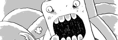 The story, such as it is, is quite thin. Yet Forsythe never introduces a character that won't later have some use to the plot and eventual outcome of the story. He also keeps things lively by first introducing inanimate objects (such as a camera) and then having them surprisingly come to life. Forsythe continually ramps up the action by pulling back from the action to reveal yet another, larger, more threatening monster. Cleverly, he turns that size differential into an important plot point in the book's eventual resolution, turning a device that created tension into one that evoked laughter. This book started as a webcomic and it shows with the way Forsythe seems to be compelled to make each page its own comedic unit and the way he stitches them together as a continuing serial. The flow of the book is sometimes interrupted by two-page spreads that split apart single images. "Losing" part of the image was distracting, though I'm not sure there was a better solution with the material as he drew it. It'd be interesting to see what Forsythe comes up with when he doesn't choose to serialize his work.