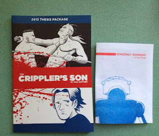 Max Riffner graduated in 2013 from CCS, but he's had a long career as a webcartoonist. He did a strip called Lydia that I quite enjoyed. The comics I'm reviewing here were part of this CCS thesis packet and include the minicomic Doomsday Democracy and the book The Crippler's Son. Using a sketchy, expressive style that reminds me a bit of a slightly less scribbly Jeff Lemire, The Crippler's Son is about a professional wrestler nicknamed "The Crippler" (a name he took from his wrestler father) and his much younger brother, James. James is an ER resident whose entire education was paid for by Jack ("The Crippler") and the success that his wrestling career brought him. The Lemire comparisons extend to his Essex County trilogy, which is a story about familial relationships and misdirection regarding same. It's also about James seeking an identity as a gay man who grew up without real family relationships or close bonds. It's also impeccably researched, as Riffner did a fantastic job researching the back story behind wrestling and the kind of terms that only insiders tend to use, and made it part of the book's vernacular. Whether or not someone knows what a "shoot" or "kayfabe" are isn't important, because the technical aspects of the sport are akin to the behind-the-scenes nature of being an ER doctor. Indeed, Riffner makes pointed comparisions between the ER doctor locker room and the wrestling locker room, even if what happens afterward is obviously different. The point Riffner makes is that James learns only too late just how much he means to Jack, and why, even as he tries to open himself up. While the relationship between the two becomes obvious at a certain point, the way Riffner ends the story gives it a powerful sense of emotional ambiguity.