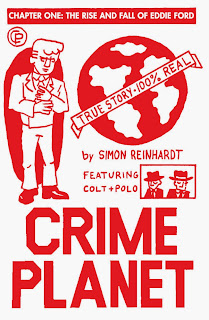Simon Reinhardt's comic, Crime Planet, is a graphically bold, if extremely silly, comic about the rise and fall of a gangster that brings to mind classic crime series like Crime Does Not Pay. Reinhardt makes up for limited rendering skill with a bold, dynamic sense of page composition, employing dense blacks on some pages to draw in the reader's eye and carefully spotting blacks on other pages so as to move the eye around the page. Starting with a boy who declares that "Crude entertainment has eroded all my moral fiber", Eddie Ford "turns to a life of crime" as a result, He gets recruited to a mysterious criminal organization called Crime Planet, and his subsequent success and eventual downfall are documented in a manner that slips between deadpan and directly comedic. Inbetween, there are various "public service announcements" for neighborhood watch announcements with secret codes and a corpse protection service. Like New's comic, it's all good dumb fun. Reinhardt doesn't quite have the chops to pull off every visual gag he attempts, and that's a strain on the reader at times, but the boldness of his storytelling does offset this difficulty.