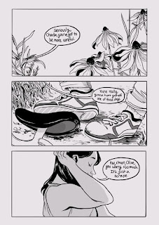In many respects, she's working in a purely naturalistic tradition. A look at the first page sees three perfect establishing panels, formatted horizontally. The first panel is a carefully-rendered shot of some flowers. The second is a pair of feet and a bicycle seat, clearly fallen next to the flower bed. The third is a beautiful establishing shot of Charlie, her eyes closed and in profile, a sly and relaxed smile on her face. The first panel establishes Charlie's name, the second panel acknowledges an accident and the third introduces both a sense of relief and her best friend via dialogue, Olive. The character design, especially the exaggerated size of both women's eyes, reveal that manga influence. It's actually a bit jarring at times, seeing this juxtaposition of styles, but Valero-O'Connell makes it work thanks to her absolutely sterling layouts. Her use of negative space and her ability to balance elements in a panel is remarkable. Her lettering does get a bit cramped at times, but she chose a really tough route in using both uppercase and lowercase letters. Her use of a grid variation shows an advanced understanding of how form can affect emotional content.