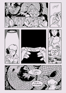 For example, this story of two friends hanging out, enjoying the routine of being with each other day after day, first hits a speedbump on a page where the first three panels on the page are either filled with detail (panel one) or else make extensive use of white negative space (panels two and three). Panel four is at the center of the grid, and it's a disturbing fortune from a fortune cookie that Olive opens that is entirely offset by black negative space. Valero-O'Connell then uses a modified mirror technique, making panel five be a shot of a concerned-looking Charlie and the final panel at the bottom collapsing into a single image that mirrors the first panel, only it zeroes in on Olive at the bottom right corner, with the rest of it taken up by a dragon mural. That fortune is the first of a variety of seemingly supernatural elements, or perhaps hallucinations, from people around her. The rest of the comic follows from that moment, ending as a meditation on death, grief and healing. Valero-O'Connell perhaps lays it on a little thick toward the end as it becomes obvious as to what's going on, but she makes up for that with the last five pages that confront tragedy head-on. Her level of craft and storytelling is as good as it gets for a young cartoonist, and the next step for her seems to be more a matter of refinement and nuance, especially in terms of characterization. She's illustrating a book for First Second that's coming out, and I hope she's coloring it as well because that's yet another strong element in her toolbox. It won't be long before she's writing and illustrating her own books.