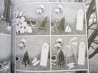 The way the book is designed also reminds me a bit of Edward Gorey. Essentially, this book is a tour of haunted places, with text on the left-hand pages and images on the right-hand pages, so that it's less a comic than it is illustrated text. The narrator is knowledgeable but not omniscient. For example, there's the chilling "The Secluded House." The illustration is of a small, unassuming house in the middle of a vast field. The viewer's perspective is from a picket fence maybe fifty yards from the house. With a cloudy sky and densely-hatched and blackened grass, the drawing is somewhat ominous, but what really inspires dread is the description: "All that is known is that any person who ventures closer than this does not come back." After giving the reader intimate details of the history and effects of other haunted houses, that simple sentence is chilling. The narrator has no power to inform or save the reader, if they ventured any closer.