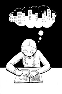 Sara Edward-Corbett: In #20, her "The Bird, the Mouse and the Sausage" was one of her best pieces. Her comics have always had the preciseness of certain kinds of children's illustration, and this story is very much in the vein of a fable. Her use of negative space is exquisite, be it the bright white space in nearly every panel or the deep black of her trees, marked only be a series of thin, white vertical lines. As a result, the spot colors she uses really pop out on the page. The story is about an essentially polyamorous (but asexual) trio whose equilibrium is shattered when the bird mates with another bird. An act of jealousy winds up dooming both the mouse and the sausage, who calls into questions its very identity as an anthropomorphic being in the course of the story. Like most of her work, it's funny, sad and a little savage. In #21, "Afraid of the Dark" is a whimsical, delightfully-drawn story about an anthropomorphic desk, umbrella and box kite that leave a classroom late at night to wander the forest and cemetery. The denseness of her hatching and cross-hatching provides an interesting contrast to the benign nature of the story itself. It's a mood piece above all else, but that mood is "whimsical".