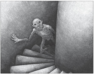 Other descriptions, like "Drowned Shelley", mix the morbid and the whimsical. This house is haunted by a girl drowned in a bathtub by her stepfather. The narrator rattles off various ways one can make the ghost of Shelley appear, from drowning you in your sleep to leaving hair in your breakfast dishes to kicking you "somewhere delicate" at midnight. Some of the images are just hauntingly beautiful, like a set of lace curtains blowing in the wind of a dark house with The Woman Outside The Window howling inside. Other stories are silly and strange, like the text for "Wandering Smoke" being smoke, as the house itself is beset by the weird vapors. Some of the houses that Catmull describes are just odd and mostly impenetrable, while others feature threats that will kill intruders, like the Crawling House (which moves northeast at the rate of ten feet per year, and reduces anything that stays in it to bones overnight). Every page is a beautiful new discovery, and this book is a must for fans of great horror drawings.