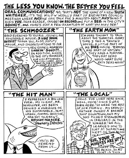 The Less You Know, The Better You Feel #2, by Mary Fleener. This early alt-comics era standout continues to draw political comics for The Coast News, focusing in on local government greed and calling them out for getting in bed with big developers trying to extract every dollar possible from her idyllic and arts-oriented beach town in California. Fleener's at her best when she gets into particulars, like in the above strip about the right of every citizen to speak for three minutes at every city council meeting. Another strip gives advice on how to be effective when given that platform. Fleener also veers away from politics to offer amusingly-illustrated recipes, complain about aggressive bikers (those strips are especially hilarious), talk about the local flora and fauna or whatever strikes her fancy. Still learning on the job as a political cartoonist, she's making much better use of simple and striking images and cutting back on fussy over-labeling and complicated drawings. Strips where she compares a local politician named Stocks to MacBeth (complete with the three witches and their cauldron) are a good example of this powerful image-making. Fleener is a naturally funny cartoonist, and it's been interesting to see how she's allowed her whimsical nature to merge with her sharp, focused political instincts to provide cartoons that are memorable and brutal. She's not afraid to repeatedly get out the long knives to carve up hypocrites and greedy politicians who would prefer that the public simply ignore what they're doing.