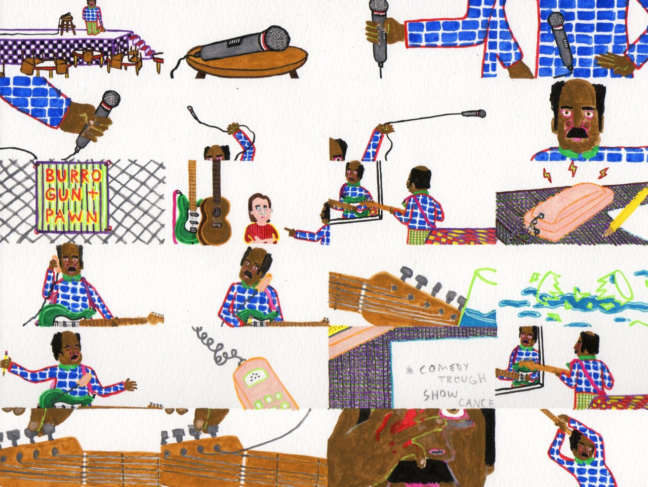 Strong Eye Contact, by Christopher Adams. One of 2dcloud's virtues as a publisher is their willingness to give emerging artists a platform for unusual and nonintuitive work. Christopher Adams is a perfect example of this, as his work is immersive in a way that's unusual. Instead of demanding that the reader allow a complex page with little negative space to slowly reveal itself to them like many immersive artists, Adams instead offers up variations on narrative that contain a great deal of negative space but focus on quotidian moments and an emotional journey without the anchor of dialogue or narrative captions. Adams walks the line of providing a clear emotional through-line while leaving much of the narrative itself for the reader to decipher. The book is about a stand-up comedian who happens to be African-American; both are interesting choices because Adams seems to be going out of his way to write about someone whose experience is similar to his in some ways and radically different in others. The unnamed comedian is a different race than Adams and specializes in an art that is almost entirely reliant on audience reaction for success. The book's title hints that the story is very much about performance, and the titular "strong eye contact" is a key to a comedian connecting to and engaging with their audience.