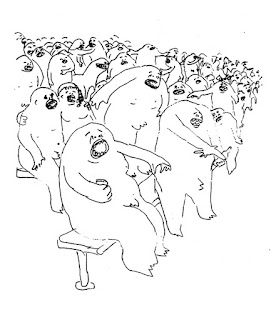 This book is about being an outsider, experiencing it personally and experiencing with people even further on the margins than oneself. It addresses abuse and mistreatment with a restrained, even emotionally distant voice--both in terms of things that happened to Holden as well as the abuse he heaped on others. (That includes several stories where John was extremely cruel to his younger brother Luke in some pretty funny ways). It's a book that aims to tell uncomfortable truths about the ways that children treat each other, especially for being different. It tells the same uncomfortable truths about the ways in which adults repeat the behaviors that they've learned and stay in the same kind of power roles. His stories about working with the disabled, rather than trying to make himself look good, are all about the ways in which it can be incredibly difficult and frustrating to interact with those on the far fringes of society. The impatience and lack of empathy displayed in these stories partly came about from what seemed to be years of working the job and having the illusions that he could make a difference in their lives smashed to bits. Like them, and like everyone on the margins in this book, every day is simply about survival and having a sense of humor regarding the chaos of our world. The drawings simply reflect the emotional truth of humanity, which is both ugly and funny (and to our horror, sometimes funny because it is ugly).