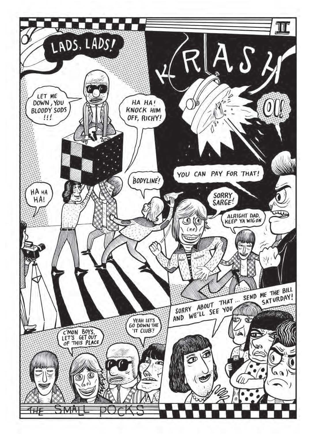 The book's central narrative is the race to find an antidote to Vic's shrinking in time to perform on the enormously popular live TV show Ready For Pop, a send-up of shows like Ready Steady Go. The hero of the book is Detective Chief Inspector Ladyshoe, who leads a Scotland Yard team in search of clues. The book unfolds like a storytelling problem that Hurk created for himself, laying down new narrative pipe in chapter after dizzying chapter until finally bringing all the threads together. Along the way we meet a washed-up, alcoholic comedian given a chance to host the show, a string of Vic Vox's rivals that included anarchic Rolling Stones analogues called the Small Pocks, absurd police sketches (a truly inspired gag!), the initiation rites of a local Masonic-type lodge, the ambitions of a young female pop singer & her manager-boyfriend, the sinister machinations of an American cigarette company, assorted charismatic and thuggish British gangsters, gunplay, fisticuffs, billiards halls, assassin monkeys and the like.