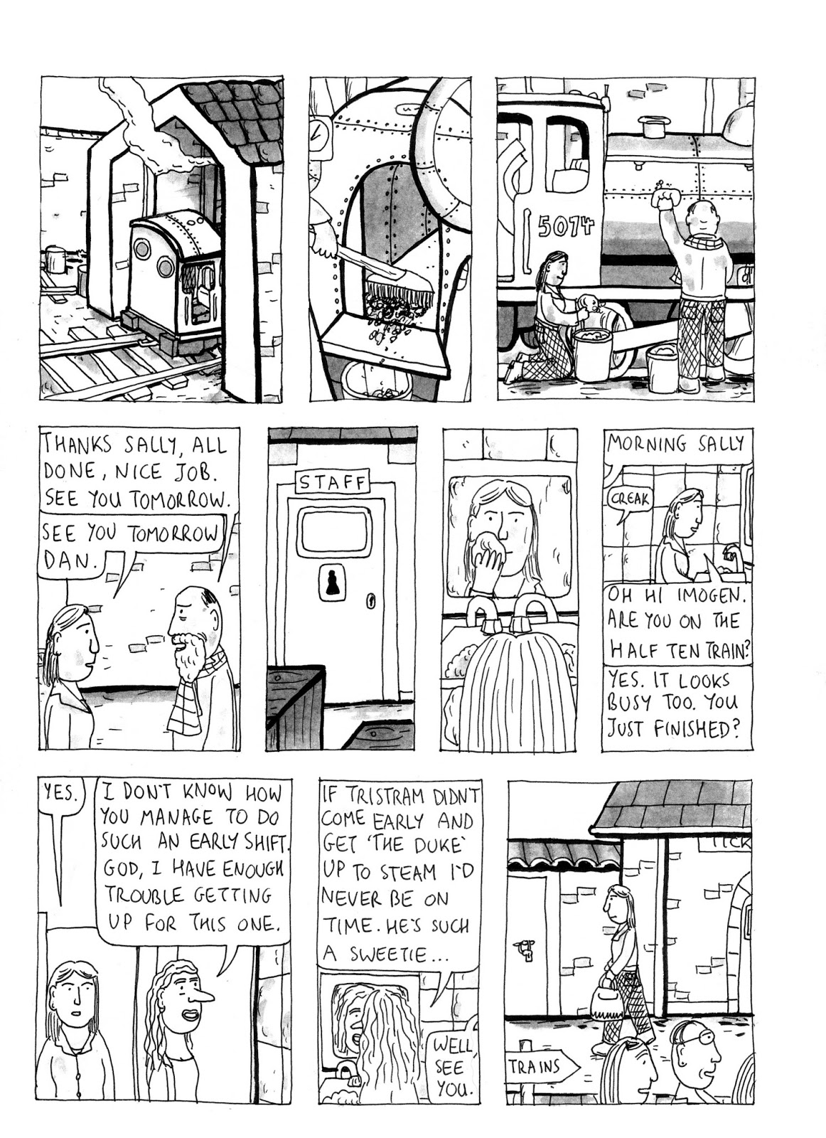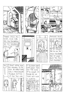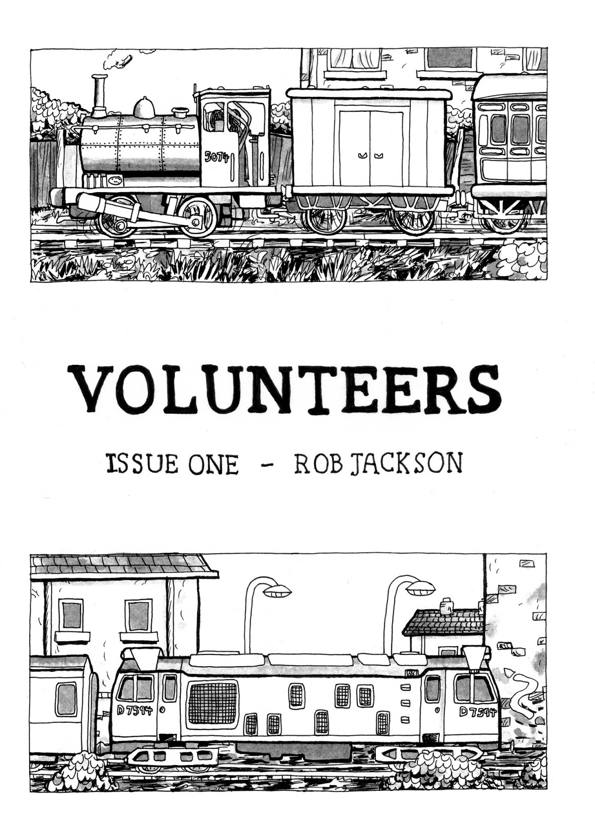 I've been reviewing Rob Jackson's comics pretty much as long as there's been a High-Low, and his wonderfully eccentric sense of humor continues to drift into new narrative directions. His three issue series Volunteers has the look and feel of someone who has some direct knowledge of (quite literally) trainspotting, or at least the industry born out of nostalgia for old modes of transportation that include trains. Jackson starts with a simple premise: a group of highly disparate people are volunteers for an old-fashioned railroad line that provides some folks with transportation, but it's mostly a local tourist attraction, with movie nights, gourmet nights, etc. The volunteers conduct the steam trains, shoveling in coal, polishing them, repairing them, etc. One thing that was obvious in reading this series is that Jackson really enjoys drawing trains and drew them freehand but with a remarkable amount of detail.