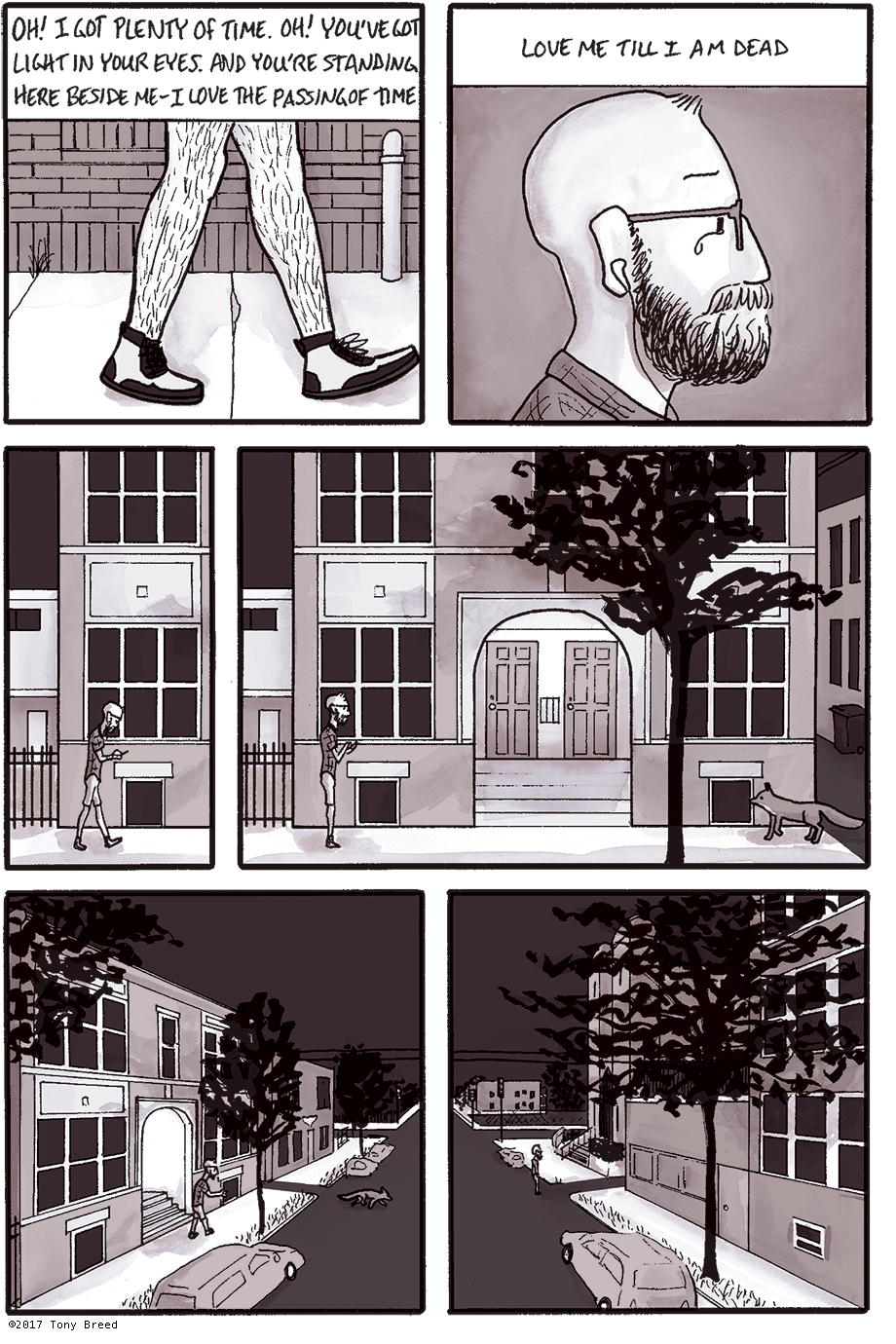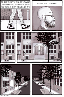 That Night: This Must Be The Place, by Tony Breed. This is a quiet, elegant and deeply felt story about the grieving process. It's about the associations music and relationships have, and how a musical cue can both exacerbate and ease pain, depending on the context. As Breed reveals in the course of the comic, his husband died six months before this story was set, and the Talking Heads song "This Must Be The Place (Naive Melody)" comes up because it was a reading for their wedding. A different version of it comes to Breed's attention in a positive way, and as he walked home from a bar, he listened to it (with the key line "Love me till I am dead" especially resonating) and saw what seemed to be a fox on the way. There's a funny epilogue where a friend tries to pinprick that scenario but asserting it was likely a coyote, not a fox, but Breed squashes it by noting that it wasn't really important as to what it was--the important thing is that it was personally significant for him. This sums up the comic, as we seek meaning and connections in the face of grief as part of the mourning process. Everything about this comic was simple: a standard 2x3 panel format, typical grayscaling, and expressive art that stays within the range of naturalism. This wasn't a comic where Breed was looking to reinvent the form; rather, Breed was working within the comfort of the form to approach some difficult emotions in a way that didn't overwhelm the reader (or him) but still got at the heart of his grief and his attempts to experience and move past that grief.