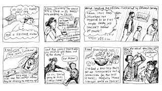 Jessica Campbell is a cartoonist who's interested in a number of different kinds of media. She's a talented writer and thinker about comics, but she also just had a multimedia show at the Museum of Contemporary Art in Chicago. It was taken from the diary of artist Emily Carr, who lived in British Columbia in the early twentieth century. This minicomic, Chicago Works, is the print version of that show, minus color and with the addition of rearranging the paintings/pieces into a steady six-panel (2x3) grid. It seems as though Campbell knew that something would be lost in translation by making the images so small, which is why publishing the works in black & white (her usual style in comics) made sense. To be sure, however, reading this comic is a different experience than going to see the show. There's less detail, everything is a bit tiny and cramped, and there's more of an emphasis on the writing than the power of the visuals.