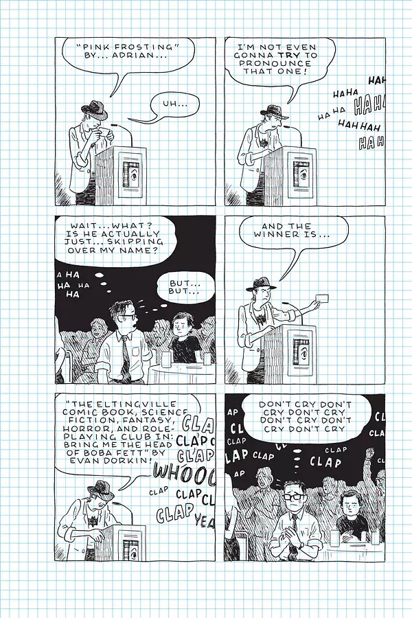 His best character remains himself, or rather a studied caricature of himself rooted in emotional truths but clearly played up for laughs. In the opening story, when he pops up on the first day of school and starts babbling about John Romita to his mocking classmates, he deliberately draws himself like a Schulz character. He's put upon like Charlie Brown but lashes out like Lucy, calling his classmates "stupid idiots." Of course, every humiliation here is specifically linked to comics in some way. His first San Diego Comicon is marked by some asshole confronting him about signing with D&Q instead of another Canadian publisher. and people burning him for ripping off Dan Clowes. The next year, he's nominated for an Eisner award and a childhood favorite, Frank Miller, is reading the list of nominees in his category. Miller makes a comment about not even attempting to pronounce his name as he then loses.