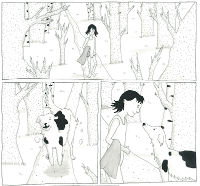 The book's real tour-de-force is Kevin Huizenga's "Green Tea", a nightmarish and sweat-inducing tale of his alter ego, Glenn Ganges. Ganges recounts a time in college when he was working feverishly and drinking green tea, when he suddenly started seeing hallucinations of a dog that he knew was going to harm him. He then comes across an account of a reverend who had a similar experience, with a demonic monkey that followed him around and eventually started speaking to him. Huizenga's deceptively simple style is at its peak here, playing with light and narrative in a masterful fashion. There's not a better story in this bunch.
