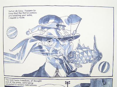 Thus far, we've seen much more of Celestino. This storyline seems to be as much about Igort's own relationship with comics and interest in their power, mystery and history as it is about a narrative. The first issue introduces us to Morvo, a sort of Winsor McCay-type strip about a man who swallowed up the night. The second issue follows Celestino's career further as he interacts with other artists, searches for inspiration and finally achieves it when he's struck by a fever. The second half of the issue concerns his sister and a horrible hacking cough that no one could cure. Bringing in a traditional healer, she induces a trance that was depicted in a series of pages that can only be described as a jaw-dropping tour-de-force. Igort's sensational imagery is marked by heavy blacks, dense cross-hatching and blues both oppressive and comforting. She saw a strange man called Wolla Walla, and while she was not cured, she did become obsessed with his existence. As this issue ended, she was signaling him in the night sky, wishing to be taken away.