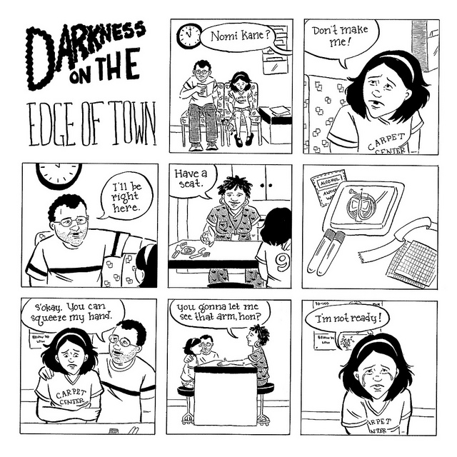 Kane is a crisp storyteller and her pages are light and airy. There were times I wished she had used blacks or hatching a bit more often just to add a bit of density to her pages. There were times when her pages lacked weight simply because of the way she structured them, with eye-popping images sometimes occurring away from the center. Kane gave equal weight to every panel, it seems, and without leading the eye to certain key panels, certain images (like vomiting at a doctor's office or seeing an array of needles) lost some of their power. That said, Kane gets lots of key details right. Her lettering and logo design are both impeccable. She combines a certain looseness of detail with her naturalistic rendering approach. Her faces are expressive and her use of body language helps convey a lot of information without words. Like Frakes, there's a tight bond with the rest of her family that's an inextricable part of her personal narrative.