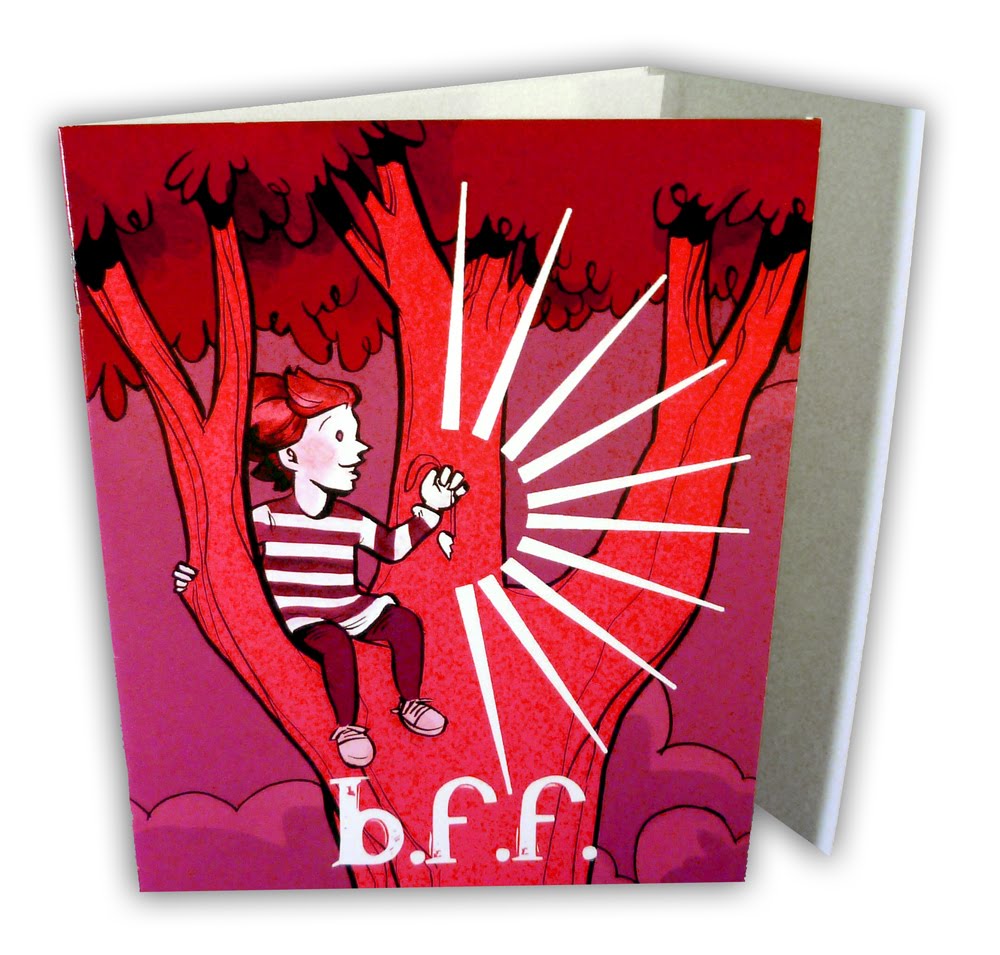 Morning Song and b.f.f by Laura Terry. Terry has always been a strong storyteller with a distinctive voice, but these two minis demonstrate a newfound devotion to craft and detail. They're both what I refer to as "convention minis"; that is, minicomics that are art objects as well as comics. They generally tend to be slightly flashier and more gimmicky than a standard mini. What makes these minis by Terry stand out is the way she manages to fold in function along with form. The gimmick of each mini serves the actual story (slight as it is) well, and the story would not be able to function well if it didn't appear in this particular form. Morning Song, for example, is an eight-panel comic. It's about a young man whose fiddle playing gently nuzzles the wildlife from sleep to wakefulness. It's tucked into a cute cardboard rodent head. When you pull the comic out, we then read the first two pages, as we see the song bringing dawn. The reader then unfold the comic up to reveal the next four panels, as we meet the musician. Finally, we unfold the comic one more time to its full 11 x 17" length to see the final scene. Reading this wordless comic takes less then thirty seconds, but the physical experience of folding and unfolding it is a clever way of making the reader understand the passage of time.