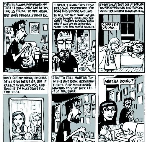 Kane obviously has a lot of talent and is comfortable working her way around a page. I usually tend to tell young cartoonists to clean up their line because they over-render. In Kane's case, there were times that I thought she under-rendered, where a more detailed line could have added additional poignancy to Kane's childhood dilemma. Indeed, the scenes where young Nomi is in a car are some of the most memorable because Kane pays so much attention to hatching the car seats. I understand that she was going for a positive and uplifting book and genuinely had a great time being raised by her family, but I wish she had pushed the boundaries of her storytelling a little bit more. I'll be curious to see if Kane's comics continue to be on the ephemeral side, if she evolves into a completely different kind of cartoonist over time or if she manages to combine the frothier aspects of her comics with a darker tone. Since her storytelling fundamentals are so rock-solid, Kane is one artist that I'd really like to see experiment as much as possible with a more immersive style.