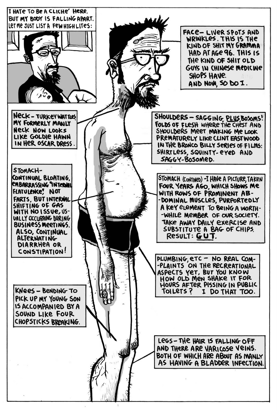 Girard's approach is as loose as Ollmann's is labored. It feels like something torn out of a sketchbook, with no narrative captions, no chapter separations and no panels. Each page feels open and loose, an organic and relaxed approach that belies the sheer relentlessness of Girard's comedic assault upon the reader and his own person. The very first page introduces the reader to Girard's self-caricature, an awkward & stubbly presence throughout the book. The character is obsessed with being considered a "winner" and so is lured to the reunion by an email from a girl for whom he always harbored a crush. He hides that from his girlfriend as he decides to lose fifty pounds to look good for his old crush. That triggers a series of events where Girard, to use some delightful Yiddish terms, is both schlemiel and schlemazel. That is, he's an awkward person who manages to offend and annoy any number of well-meaning friends and acquaintances, as well as someone who has a lot of bad luck.