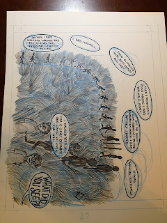 The same is true in "Unkindness", which is one of McFadzean's very best stories. It's typical of his work in that it depicts small town life in Canada in an entirely unromanticized fashion and also contains unexplained elements of magical realism. While there's a strong streak of naturalism running through his work (the world he creates feels quite solid and real), his character design here is looser and more expressive. He allows for a certain rubbery quality of reality that gives him the opportunity to mold and bend it. An "unkindness" is what is referred to as a gathering of ravens, and there is indeed a mysterious and surprising visitation by the birds in the dead of winter. The birds observe, feed and even communicate (one says "goodbye" to a little boy), often by creating a series of mysterious lines and circles in the snow. The title also refers to small acts of unkindness in the story, leading up to a mother essentially telling her teenage daughter that she was a mistake. There's a sureness to the way in which McFadzean flips from character to character in this story, each of whom are just trying their best to get by in life without a whole lot of happiness or fulfillment. When one character tells another "I'm going home to run out the damn clock like I do every damn day", it's a brutal statement of how life is that comes after a joke that covers up that fact. There's also a sort of hidden momentum and tension in this story generated by the wild card factor of the birds and the repressed emotions that well up as the story unfolds, exploding in a manner that is unexpected. It's also a story about different entities being at cross-purposes and being unable or unwilling to fully communicate their desires. That's made literal in the mystery of the ravens--there's no real sense of what their purpose is or if they mean harm to the humans in the town, but it's also expressed in the way that characters talk past each other. McFadzean never spells out the secrets and mysteries in his stories, preferring that they hold a charge for the reader to interpret as they see fit.